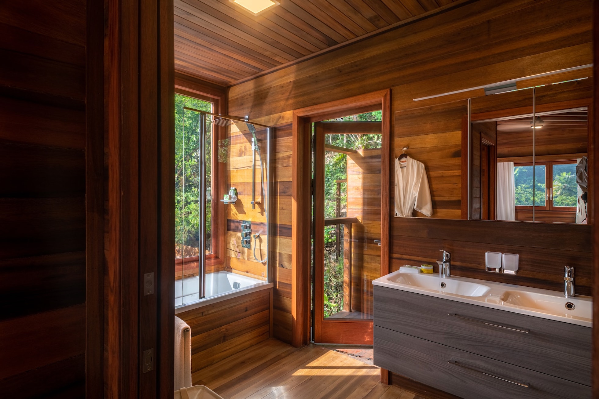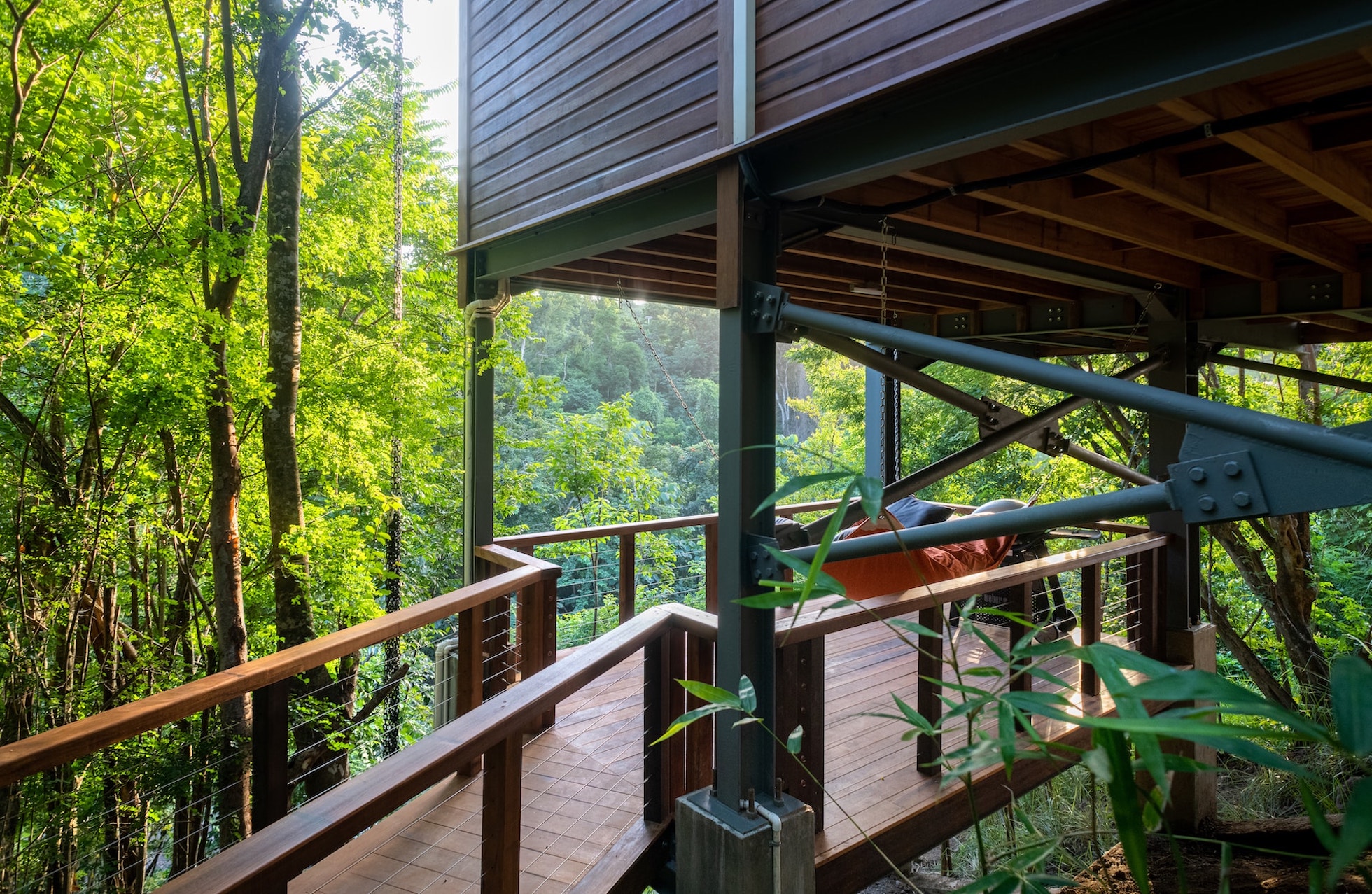 - Outdoor rain shower suspended above the treetops