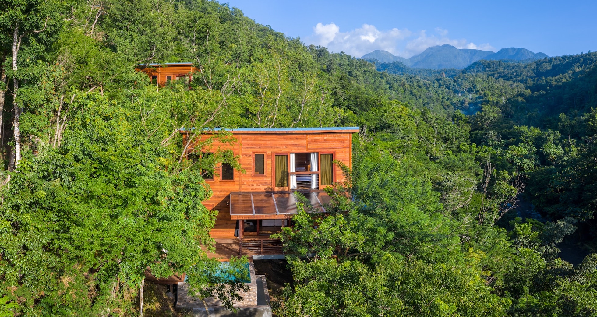 Tucked seamlessly into the lush landscape, this Ti-Fèy Villa is a sophisticated treehouse retreat designed for luxury and seclusion. Floor-to-ceiling glass walls invite panoramic jungle-to-ocean views, while a private plunge pool and a cantilevered outdoor rain shower immerse guests in nature. Offering a flexible layout, the villa features a king-size bedroom with an en-suite bathroom, a gourmet kitchen, and an additional half-bedroom with a separate bath. Thoughtfully designed for comfort and adaptability, it provides the perfect under-the-radar hideaway.