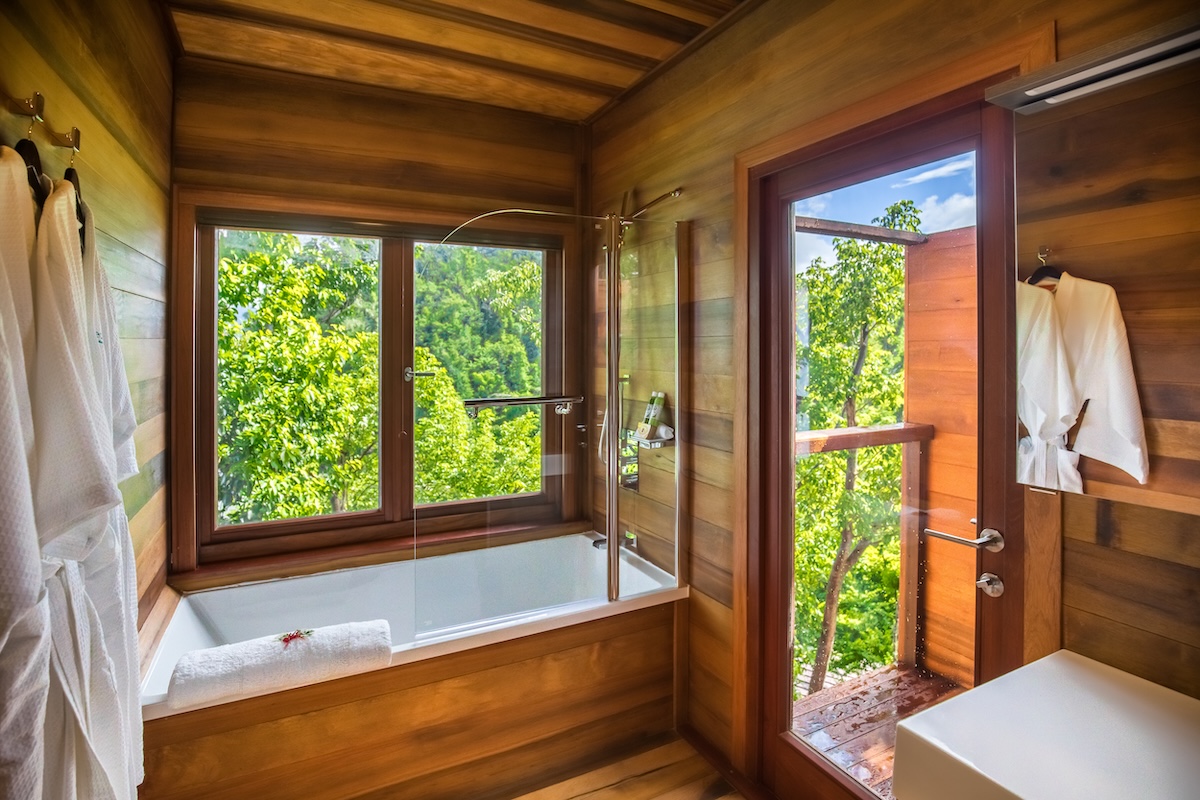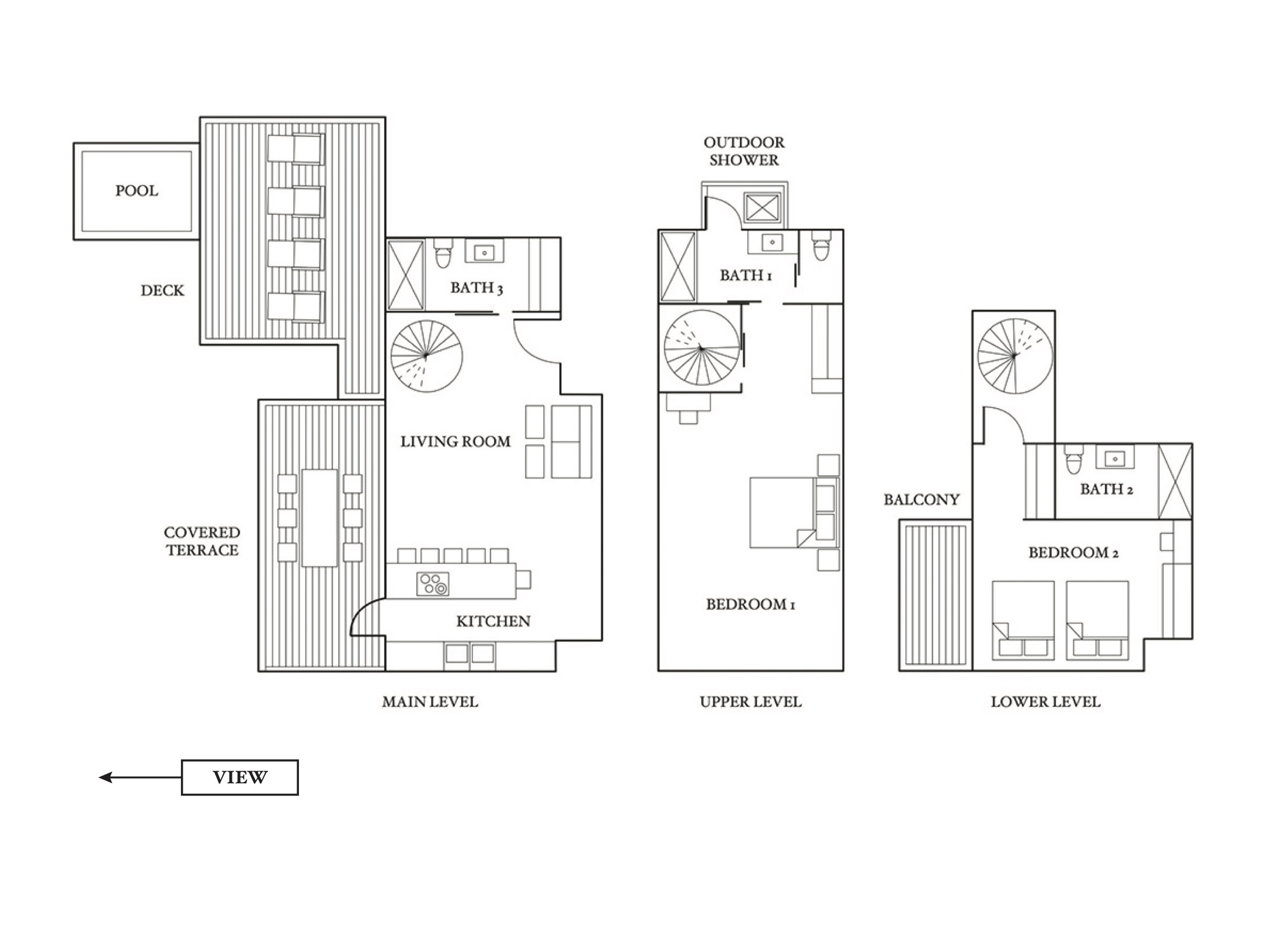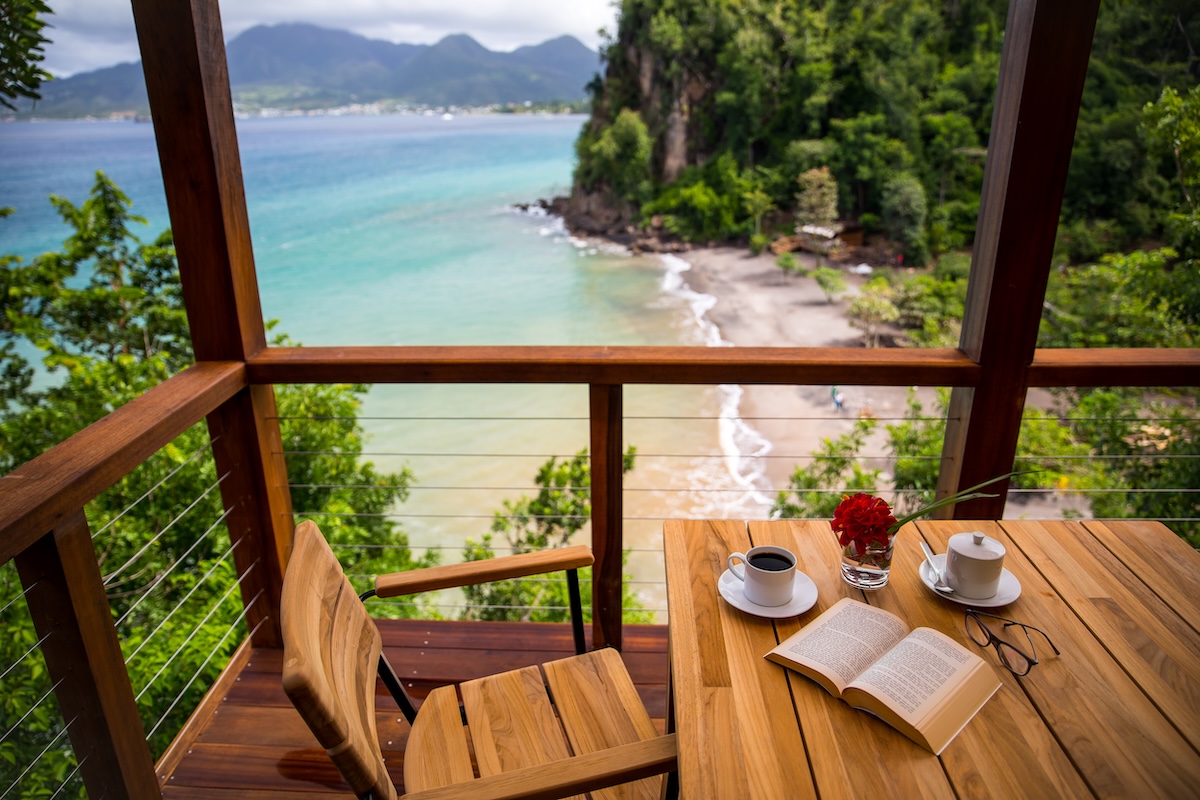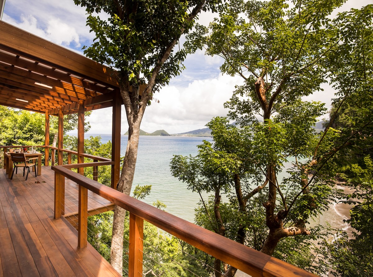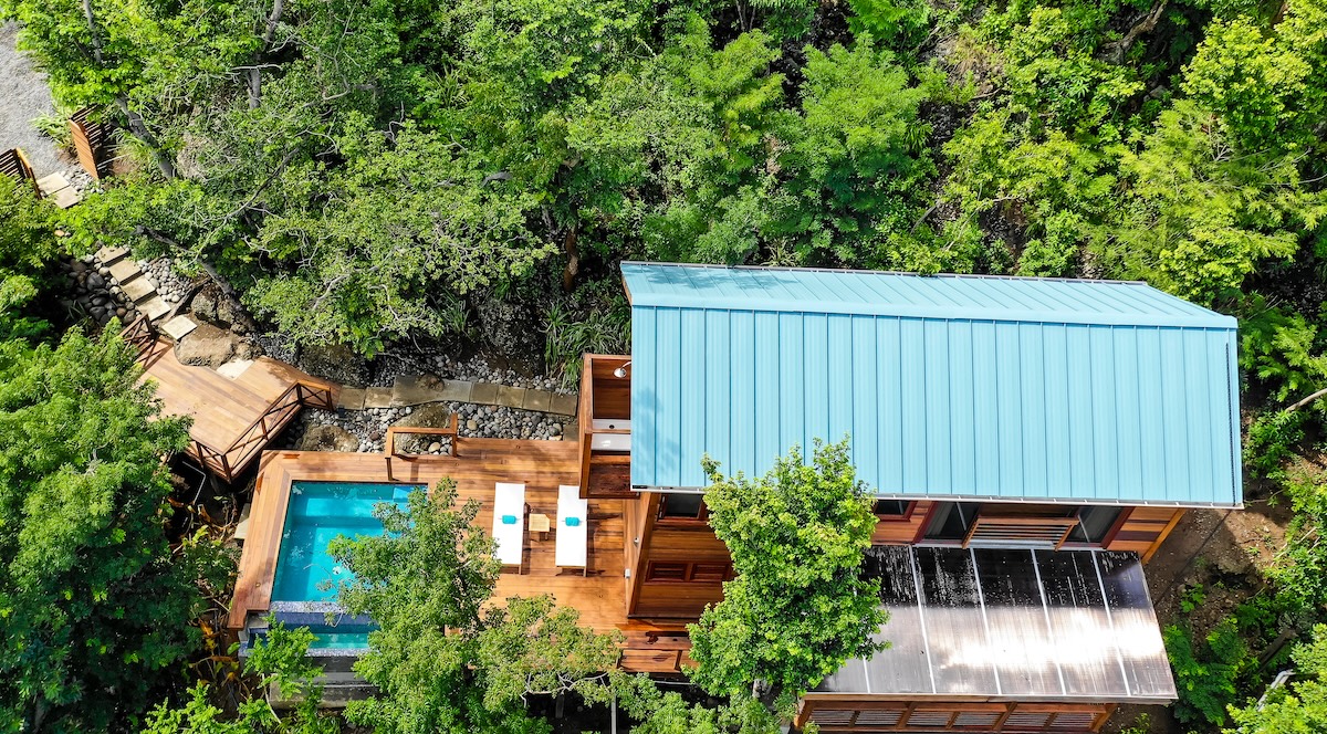 Tucked seamlessly into the lush landscape, this Ti-Fèy Villa is a sophisticated treehouse retreat designed for luxury and seclusion. Floor-to-ceiling glass walls invite panoramic jungle-to-ocean views, while a private plunge pool and a cantilevered outdoor rain shower immerse guests in nature. Offering a flexible layout, the villa features a king-size bedroom with an en-suite bathroom, a gourmet kitchen, and an additional half-bedroom with a separate bath. Thoughtfully designed for comfort and adaptability, it provides the perfect under-the-radar hideaway.